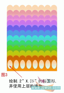 使用橢圓工具繪制一個.20”x.35”的橢圓,并將上層圖形的顏色復(fù)制到新繪制的橢圓中。將該圖復(fù)制7遍,并如圖中所示排列,如果不齊可使用“對齊”工具中的均勻分布功能加以調(diào)整。群組所有圖形。效果見圖(3)(小技巧提示:各位在復(fù)制圖形屬性時,比如顏色等,我們可以通過右鍵點擊圖形并拖放到目標(biāo)圖形的方式解決)。