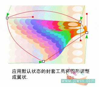 這工作比較復(fù)雜,讓我們干吧!首先,選取調(diào)和并群組后的對象,逆時針旋轉(zhuǎn)90度并按圖中所示的樣式將其置于上一步畫好的翼狀圖形中心。在主工具欄中選取造型工具的“封套”功能,在默認(rèn)狀態(tài)下,使用鼠標(biāo)分別拖動封套的四個頂角,即(圖5)中綠色箭頭所指的地方,使圖形各邊扭曲變形,并移動到示意圖所示的位置。該過程試圖將我們做好的調(diào)和圖與后畫的翼狀圖重合,從而制作出一個蝴蝶翅膀的雛形,效果見(圖5)。