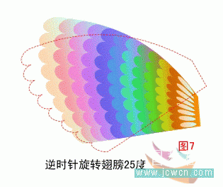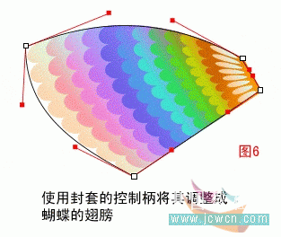 接下來,繼續(xù)該圖封套效果的制作,使用鼠標(biāo)分別調(diào)整該圖四角的控制柄,直至調(diào)和圖與翼形輪廓圖各邊吻合,效果見(圖6)。怎么樣,有點蝴蝶翅膀的意思了吧!(封套效果是coreldraw這款軟件,在制作異體圖形過程中最為強大的后期調(diào)整武器)。調(diào)整完成后,清除翅膀輪廓線。