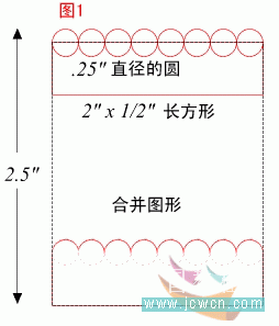 選取圓形和小長方形,在“排列”下拉菜單中選擇“合并對象”功能,該過程將清除圓形的下邊及長方形的上邊,構(gòu)成一個完整的圖形,復(fù)制該圖并將其置于原圖之下2.5”處。效果見(圖1)。