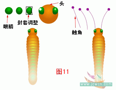 在這節(jié)里我們介紹如何制作蝴蝶的頭,眼及觸角。首先,繪制一個圓形作為頭,并為之填入與軀體上部相同的顏色。將頭通過shift+pagedown的快捷方式置于軀體之下,并稍微向下移動一點。再繪制一個小圓,并使用深綠(rgb 0, 102, 0)和中綠(rgb 102, 255, 102)為其進行圓形漸變著色。接下來,選取該圓并為之應(yīng)用默認(rèn)設(shè)置的封套效果,將其調(diào)整成圖中的效果。為使眼睛更為有神,我們再使用圓形工具繪制一個白色小圓作為眼部的高光點。復(fù)制群組后的眼睛,做水平鏡像,然后將兩個眼睛分別置于頭部兩側(cè)。使用貝塞爾線條工具繪制一條紫色的線條,然后通過節(jié)點調(diào)整工具將其按圖中的樣式調(diào)整為曲線。接下來,我們再畫一個紫色的小圓作為其觸角的頭。群組兩圖,復(fù)制并做水平鏡像,然后分別置于頭的上部兩側(cè),效果如(圖11)。