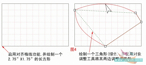 啟動“對齊格線”功能,繪制一個2.75”x1.75”的長方形,圖中的粉色虛線格子代表輔助格線的寬度為1/4”。使用自由筆工具繪制一個三角形,圖中標(biāo)為綠色虛線。取消對齊格線,使用對象編輯工具,按圖中所示的方式調(diào)整該三角形,圖中標(biāo)為紅色。調(diào)整后的結(jié)果是該圖形上邊和左邊分別成弧形,正個圖形象一個蝴蝶翅膀,效果見圖(4)。
