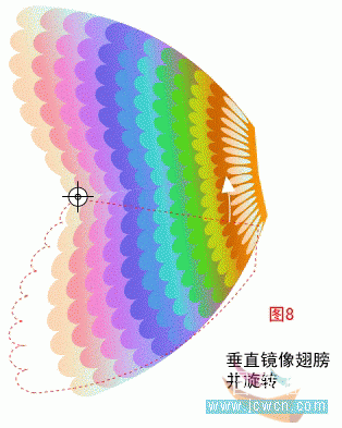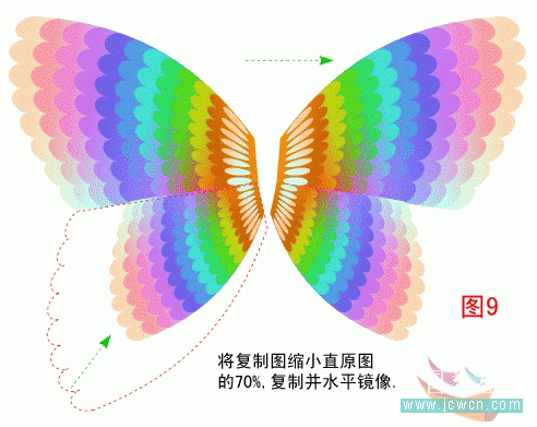 接下來,將復(fù)制圖縮小為原尺寸的70%,并如圖所示位置安置。圈選上下兩翼,復(fù)制,并為復(fù)制圖做水平鏡像處理。好了,現(xiàn)在我們的蝴蝶羽翼豐滿就差身軀了。效果見(圖8)和(圖9)