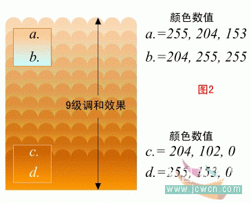 使用填充工具的線性填色方式為上部的合并圖形著色,選用顏色數(shù)值為a和b。接下來,使用圖中的c,d兩色為下面的圖形應(yīng)用線性漸變色。選取工具條中的“調(diào)和”工具,然后點選下面的波浪狀圖形,并向上圖拖動鼠標(biāo),使之產(chǎn)生漸變的調(diào)和效果。在屬性欄中將調(diào)和層級設(shè)為9,效果見(圖2)。