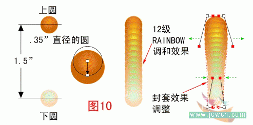 繪制一上一下兩個直徑均為.35”的圓形,并分別填入圖2中使用過的顏色。其中上面的圓使用c,d兩色的圓形漸變色,填色中心點如圖中所示。為下面的圓形填入a,b兩色的圓形漸變色,中心的調(diào)整如上圖。選擇兩個圓形并為之應(yīng)用12級的rainbow調(diào)和效果,接下來,使用“造型工具”中默認(rèn)方式的“封套” 效果進一步調(diào)整蝴蝶的身軀直至圖中的效果。效果見(圖10)。