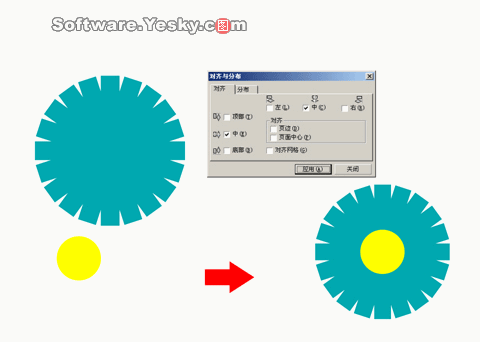 使星形保持在選中狀態下。點擊菜單“排列”下的“結合”,或直接按快捷鍵“ctrl+l”,把這些線條結合為一個對象。齒輪中間有一個孔,下面我們給齒輪中心挖一個孔。使用橢圓工具畫一個適當的圓。選中所有圖形,按住alt鍵,再按三次a鍵(按鈕alt鍵是用來激活菜單,按一次a鍵展開排列菜單,再按一次a展開對齊與分布菜單,第三次按a鍵,執行其下的對齊和屬性,打開對齊與分布對話框,由于一步步的有鼠標展開菜單比較麻煩,一般常用的命令都使用快捷鍵,在cd9上面只需按兩次a鍵即可)。打開“對齊與分布”對話框。選中水平中心和豎直中心,點應用按鈕,對齊圖形(如圖5)。