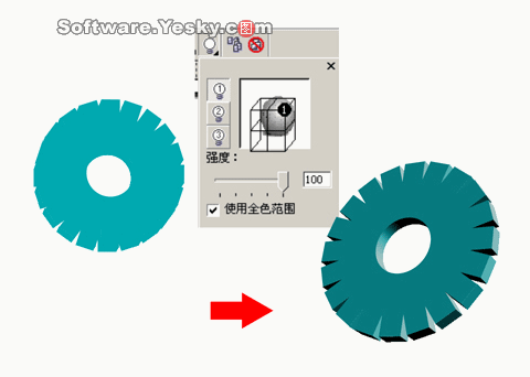 點工具欄上的“照明”工具,彈出一個調節面板。照明就是給剛才的3d效果增加外部燈光,這和3d軟件十分類似,不過和3d軟件的燈光系統相比要簡化了許多倍。我們選用“燈光1”。打開燈光后,最終效果如圖11。