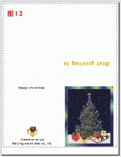 群組你繪制的所有物件,并復制它們。在coreldraw的“版面”下拉菜單中選擇頁面設置,然后在其版面選單中找到名為side fold card的頁面設置(該設置將產生一個兩折的圣誕卡,其折疊方式如(圖13)中虛線所示),點擊確定后,其設置結果如一張全尺寸的頁面,按(圖13)所示,粘貼圖片于頁面上并做相應調整。到現在為止,我們終于完成了所有圣誕卡的制作過程,當然各位還可根據自己的喜好調整圖片的位置,并加入問候語,以體現自己的特點。最后大家可以通過打印預覽來檢查確定圖片所處位置是否位于可打印區內,調整好位置,然后打印折疊好以后就是一張很漂亮的賀卡了!