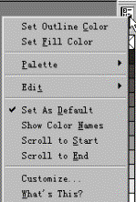 在幕屏右邊的色彩樣式庫的最上方,新增了一個色庫菜單,利用它,您可以進行集合輪廓線顏色、集合填充顏色、打開其它色彩庫、新建色彩庫、改變色彩顯示模式等操作。這樣,在coreldraw10中,您再也不必回到主菜單中就能進行操作了。菜單如圖3。