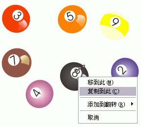 還有利用鼠標(biāo)右鍵復(fù)制的快捷方法:用右鍵拖動(dòng)一個(gè)對(duì)象到另外一個(gè)位置(注意光標(biāo)的變化),放開右鍵,會(huì)彈出一個(gè)菜單,從中選“復(fù)制到此”,ok,完成對(duì)象的復(fù)制。具體如圖8所示。