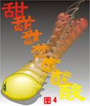 在這里我選擇中文“甜”和“酸”作為演示的對(duì)象,通過(guò)“調(diào)和”的漸變功能產(chǎn)生由甜到酸的變化。為加強(qiáng)演示效果增加戲劇性,我還在畫(huà)面中加入了能讓人聯(lián)想到甜的櫻桃和酸的檸檬。這兩個(gè)物件可以在coreldraw附帶的圖庫(kù)中找到,各位也可根據(jù)自己的口味任意選擇其它的物件。整個(gè)畫(huà)面的背景設(shè)為由黑到白的漸變色,以便突出其上的主體物件。“甜”字填為白色,而“酸”字則設(shè)為反差比較大的黑色。啟動(dòng)“調(diào)和”工具,為“甜”和“酸”兩字施以5級(jí)的漸變調(diào)和效果,其效果如(圖3)。