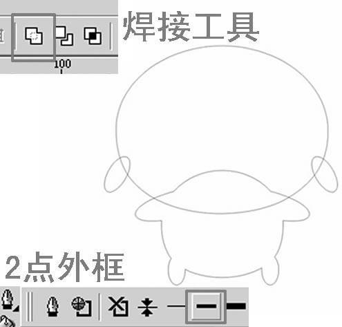 用鼠標將頭部與兩只耳朵以外的對象都選取,按屬性欄中的“焊接工具”將其路徑焊接,結果如圖3所示。