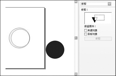 3. 選取上面的圓形,然后單擊菜單欄中的“排列→造型”,選擇“修剪”命令,系統將彈出修剪窗口,不選中任何復選項,然后單擊“修剪”按鈕,用鼠標單擊外邊的大圓,就會將小圓修剪掉(如圖3)。