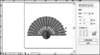 4. 接下來雙擊這個矩形,在出現(xiàn)旋轉(zhuǎn)中心點標志后,將這個旋轉(zhuǎn)中心點移動到矩形的下方部分。然后選擇菜單欄中的“排列→變換→旋轉(zhuǎn)”命令,在彈出的對話框中設(shè)置旋轉(zhuǎn)角度為10°,接著連續(xù)單擊“應(yīng)用到再制”按鈕,將矩形復(fù)制并旋轉(zhuǎn)到一定角度,同理再選擇原來的那個矩形,旋轉(zhuǎn)中心點不變,將旋轉(zhuǎn)角度為-10°,再連續(xù)單擊“應(yīng)用到再制”按鈕,最終形成扇形骨架的效果(如圖1)。