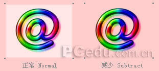如果你的圖像沒有設定背景或背景為白色,那么subtract(減少)透明模式和正常的透明模式沒有什么區別。但如果用其它顏色或紋理圖案填充背景,在正常透明模式下,位圖中的白色像素會顯示出來,如圖27b左邊的圖像所示;而subtract模式將會隱藏位圖中的白色像素,如圖27b右圖所示。
