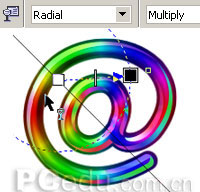 22.接下來選擇第二個對象,就是位于位圖中“a”形上部的形狀,如圖22中鼠標指針指示的對象。我們需要對這個形狀也應用和剛才相同的透明效果,較為簡單的方法是從effcets菜單下選擇copy effect中的lens from...(效果>復制效果>透鏡自...)命令,用隨即出現在屏幕上的黑色指針在我們剛才操作的第一個高光形狀對象上點擊一下,將透明效果復制過來。然后將透明中心移動到該對象和45°斜線相交處,需要的話,調節透明半徑范圍。(圖22)