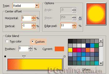 2.使用挑選工具以選取框選擇所有花瓣對象,按f11打開填充對話框,改變自定義填充選項如下:位置為0的顏色為紅色,位置在100的顏色為黃色,原來在65的洋紅色位置改為40,顏色改為黃色,確定后關閉對話框。(圖08)