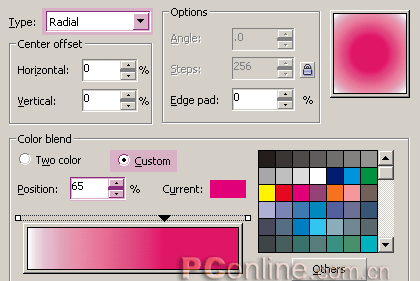 2.選擇圓形曲線的原件,下面我們要用一種自定義的徑向漸變對它填充顏色。當然,你可以使用交互式填充工具,但要快速有效的填充,按f11打開填充對話框是個更好的選擇。在填充類型中選擇radial,將顏色調和由默認的雙色改變為自定義模式,接著改變自定義填充的選項:將位置為0的顏色設為白色,位置為100的顏色設為100%洋紅。然后在65%的位置上雙擊新增一個顏色標簽,將顏色也改為100%洋紅。確定應用填充后,移除所有的對象輪廓屬性。(圖01)