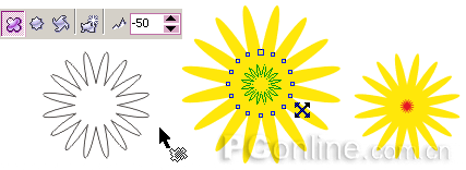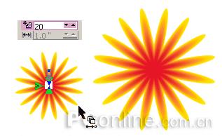 3.切換到交互式調(diào)和工具,在黃色的花瓣和紅色花蕊兩個對象間拖動鼠標,創(chuàng)建默認的調(diào)和效果。使用屬性欄選項,將調(diào)和步數(shù)設(shè)為20,點擊應(yīng)用按鈕,這個效果就完成了。(圖13)