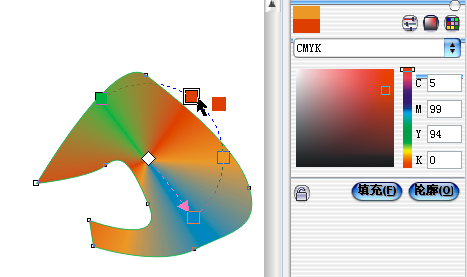 補(bǔ)充:如果是在漸變填充中,這種鎖定一樣成立,選定其中填充軸上一個(gè)色塊,然后按下鎖定按鈕,就可以動(dòng)態(tài)調(diào)節(jié)漸變了。