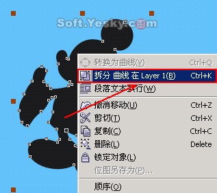 (7)為了看清這個黑色底圖是如何做的,在這個黑底圖上單擊右鍵,在單中選擇“拆分曲線在layer 1”(快捷鍵為ctrl+k)。
