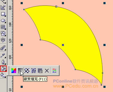 2.框選所有的圓,在上方的“屬性欄”中選擇“后減前”按鈕,從后面的正圓中減去前面的三個正圓,得到一個像傘蓋的圖形。