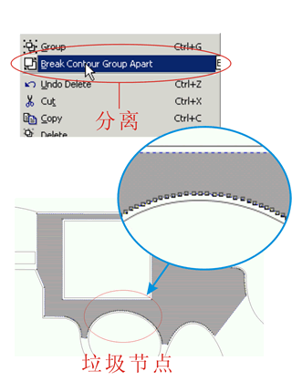 如果此時(shí)看不到輪廓的變化,可以修改一下屬性欄內(nèi)輪廓顏色。用鼠標(biāo)右鍵點(diǎn)擊該圖形,在右鍵菜單內(nèi)選擇break contour group apart(分離)選項(xiàng),使圖形與輪廓分離,然后選中其輪廓按鍵盤上的delete鍵將輪廓?jiǎng)h除。不過這樣有個(gè)缺點(diǎn)就是產(chǎn)生的節(jié)點(diǎn)太多,但是用不著擔(dān)心,用造型工具選中圖形,將會(huì)看到圖形上(尤其是弧線處)布滿了大量的垃圾節(jié)點(diǎn),下面就讓我們來個(gè)快速消滅之(如圖15)。