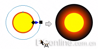 (3)在調和的起始對象(如:五角星)上按住鼠標左鍵不放,然后拖動到終止對象(如:圓形)上,釋放鼠標即可。