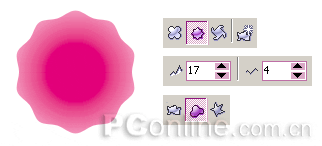 3.選擇交互式變形工具,在屬性欄中選擇zipper(拉鏈變形)模式。將振幅和頻率分別設為17和4,點擊smooth distortion(平滑變形)按鈕用以上設置進行平滑變形。這會在圓形的邊緣上增加一點輕微的波浪效果。(圖02)