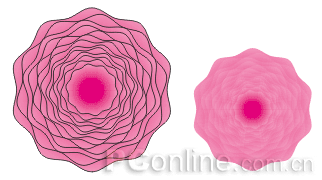 4.對那些同心的花瓣,我們可以創建中心相同的對象副本。為快速創建第一個副本,選擇挑選工具,稍稍向對象中心拖動任一個角控點的同時按下shift鍵,點擊鼠標右鍵就可以創建副本。在這里,shift鍵的作用時保證按比例縮放對象。重復這個過程來創建足夠的副本,填滿花朵中心區域(在我們的例子中差不多有13個副本)。然后隨機地輕微旋轉一些對象副本來偏移它們(如圖03中黑色輪廓所示)。使用挑選工具可快速旋轉任何對象,你可以雙擊任何選擇對象進入旋轉、拉伸模式,拖動任意角旋轉手柄來旋轉對象。(圖03)