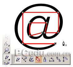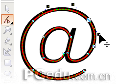 5.選擇形狀工具,在紅色輪廓上點擊一下選擇它,用形狀工具拖出一個矩形選取框選取所有所有節點。在屬性欄中,點擊convert line to curve(轉換直線為曲線)按鈕,然后拖動其中一段線條,使它盡量接近相應位置的@字符形狀。(圖05)
