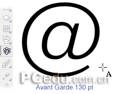 3.使用文本工具,在繪圖頁面上點擊并輸入“@”符號,字體選擇為avant garde(coreldraw默認字體)。在屬性欄中,將字體大小設為130pt,按enter鍵應用更改。(圖03)