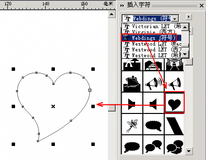 2.在右方的“插入字符”對話框中選中“webdings(符號)”字體,然后在下方選擇“桃心”符號,按下鼠標拖到編輯區中。