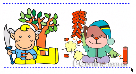 在工具箱中選中“挑選工具”后,按下鼠標左鍵在頁面中拖動,將所有的對象框在藍色虛線框內,則虛線框中的對象被選中。