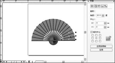 4. 接下來(lái)雙擊這個(gè)矩形,在出現(xiàn)旋轉(zhuǎn)中心點(diǎn)標(biāo)志后,將這個(gè)旋轉(zhuǎn)中心點(diǎn)移動(dòng)到矩形的下方部分。然后選擇菜單欄中的“排列→變換→旋轉(zhuǎn)”命令,在彈出的對(duì)話框中設(shè)置旋轉(zhuǎn)角度為10°,接著連續(xù)單擊“應(yīng)用到再制”按鈕,將矩形復(fù)制并旋轉(zhuǎn)到一定角度,同理再選擇原來(lái)的那個(gè)矩形,旋轉(zhuǎn)中心點(diǎn)不變,將旋轉(zhuǎn)角度為-10°,再連續(xù)單擊“應(yīng)用到再制”按鈕,最終形成扇形骨架的效果(如圖1)。