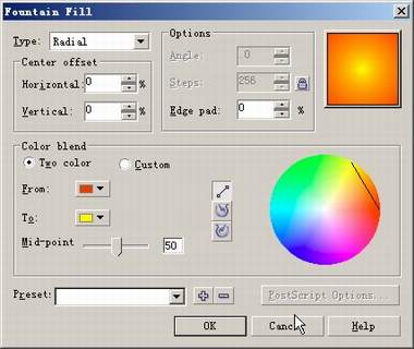 2.在橢圓被選擇的情況下,點擊fill tool—fountain fill dialog,將對話框中的參數設置如圖(2)所示:type選擇radial,color blend選擇two color,from選擇red顏色,to選擇yellow顏色。