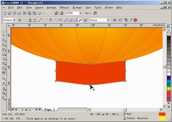 5.用rectangle tool畫一個小的長方形,作為燈籠的口。邊框選擇yellow,內部填充red。用interactive envelope tool給它加上封套。選擇窗口上屬性條里的envelope unconstrained mode,調整矩形中間的兩個點,使它看上去有些弧度,這樣會更真實、自然一些。(6)用同樣的手法做出上面的口,翻轉一下放在燈籠上。如圖(7)