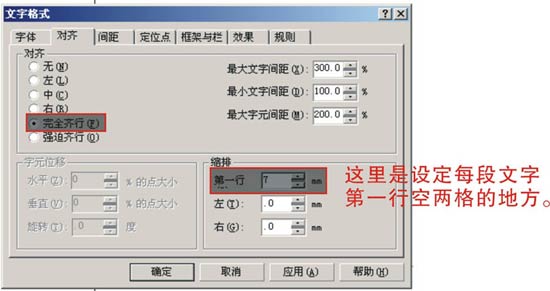 我們來仔細觀察這個面板,發現功能還是挺多的。(如圖4)a 字體面板:設定字體、字號等。一般在屬性欄里就可以設置。b 對齊面板:設定對方式的。如果是段落文本就一定要選中“完全齊行”了。右下角有一個“縮排”選項,其中“第一行”是設每一段文字第一行空兩格的地方。一般用9號字,輸入7mm就行了,字號越大,此處輸入的數字也就相應增大。此面板其他地方就用默認的好了。(如圖5)