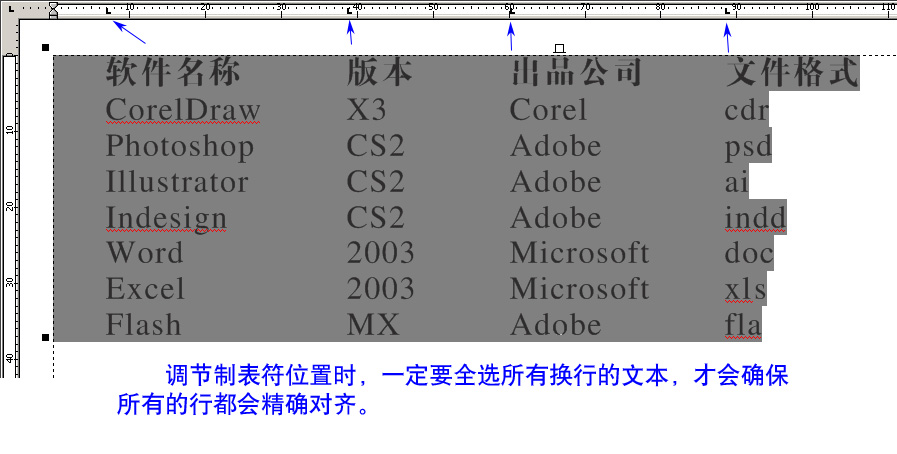 3、一般來說,cd的段落文本會默認出現很多制表符,是左齊的,可以根據自己的需要刪除沒用的,需要幾個保留幾個。