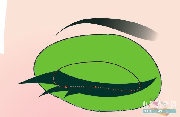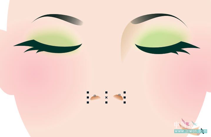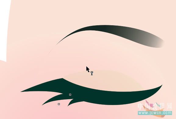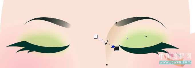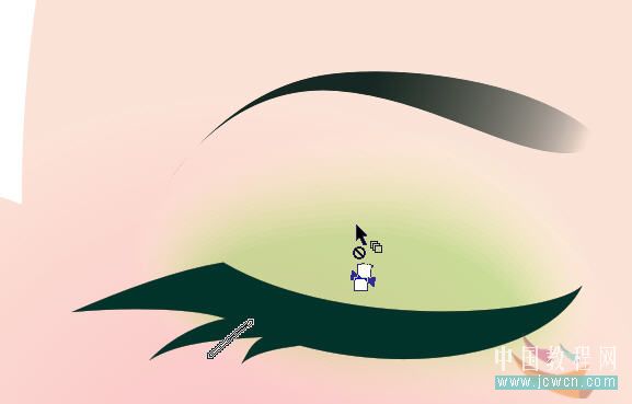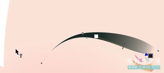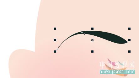 首先,使用曲線類工具繪制mm的鼻梁,填充顏色(c10、m20、y30、k0)并去除輪廓。然后再點擊工具箱中的“交互式透明工具”,從左向右拖曳鼠標,產生如下圖所示的透明效果