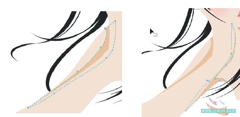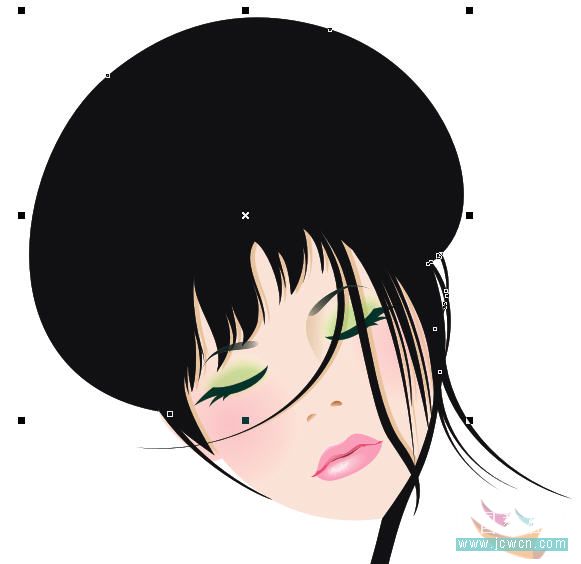 用曲線類工具繪制如下圖所示的封閉圖形,按下sfhit+pagedown組合鍵,將它置于最底層。再按住右鍵從人物臉部拖曳鼠標至此圖形上并松開鼠標,在彈出的菜單命令中選擇“復制所有屬性”命令,將臉部的顏色及輪廓屬性復制給它。