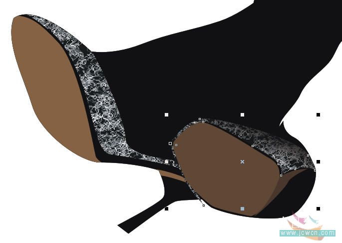 19、同樣使用修整中的相交命令取得鞋底的名個部分,分別填充褐色與圖案并去除輪廓,填充后的效果如下圖所示: