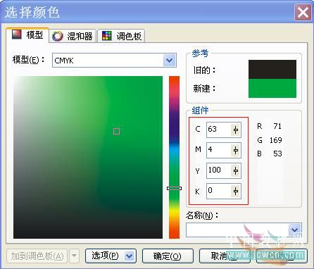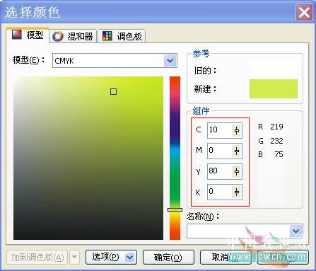 5、用同樣的方法為“顏色調和”選項區“到”后的色塊設置顏色為淡綠色(c:10,y:80),最后將“中心位移”選項區的“垂直”參數設置為17%,如圖5a所示: