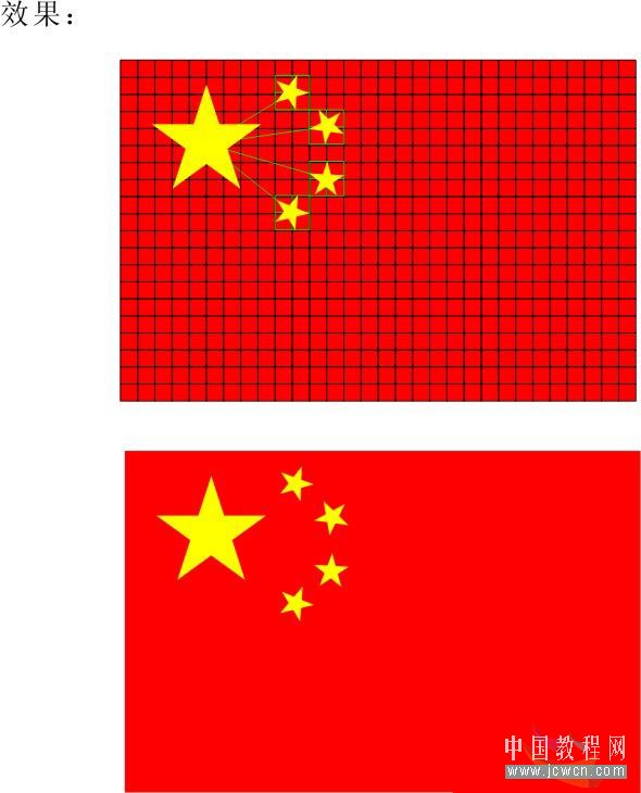 三、各五角星的大小、位置、角度如下圖所示,其中最大的五角星為水平放置,高寬均為6格多一點點,其最左邊的角在第二列邊上,最上邊的角在第二行邊上。小五角星高寬均為2格左右,位置如圖,注意其角度為:從大五角星的正中心連接線至小五角星的正中心,小五星的其中一個角剛好要在這條線上。