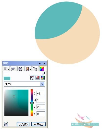 然后選擇“智能填充工具”(或者單擊工具面板的“填充工具”進行填充,快捷鍵為:shift+f11),在其屬性欄中設置填充色為薄荷綠(c:43,m:2,y:25),“輪廓選項”為“無輪廓”, 然后在內部位置單擊填充顏色。如圖3b所示: