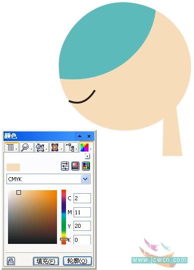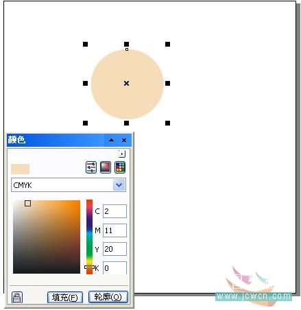 選擇“橢圓工具”,繪制一個正圓,然后填充淺膚色(c:2,m:11,y:20)并取消輪廓線,如圖2所示: