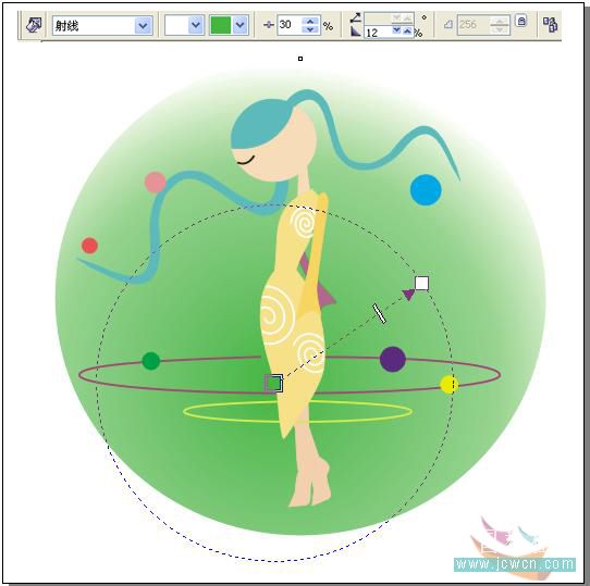 然后繪制一個大圓,按“ctrl+end”組合鍵(或者右鍵單擊鼠標,執行“順序”/“到后部”),將其置于所有對象后面,然后選擇“交互式填充工具”,在其屬性欄中設置“填充類型”為“射線”,起點顏色為淡黃色(y:20),終點顏色為綠色(c:51,m:1,y:99),然后調整漸變位置和方向,效果如圖16b所示: