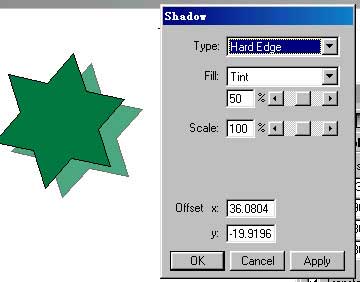 shadow工具的作用在于創建對象的陰影,使用方法很簡單,只需在xtra tools面板中雙擊shadow(陰影)工具,,在其中的type欄中選擇陰影類型,在fill項中確定顏色,確定,針對一個被選對象進行操作即可。