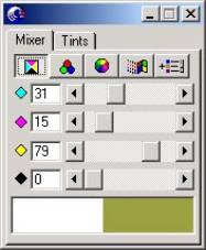 mixer面板通過(guò)幾種色彩模式與windows系統(tǒng)顏色選擇器定義顏色,面板中有五個(gè)按鈕,從左至右依次是cmyk模式、rgb模式、hls模式、windows系統(tǒng)色、add to colors(添加至色表)按鈕。在這里,主要通過(guò)數(shù)值框中的數(shù)值來(lái)定義顏色,面板下方的顏色框中會(huì)顯示出定義的變化過(guò)程。tints面板控制顏色的飽和度,利用它可以調(diào)整當(dāng)前色,也可以調(diào)整色表中的顏色。