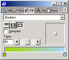 可以彌補圖片中顏色重疊部分在打印時可能出現的白邊現象。面板右側方框中的按鈕狀把手可以控制漸變的中心點位置。而下面的顏色條可以設定漸變的顏色范圍,同freehand9中一樣,在這個顏色條中可以加入多種顏色,你只需從color mixer中把配好的顏色直接拖到顏色條的下方就可以了。